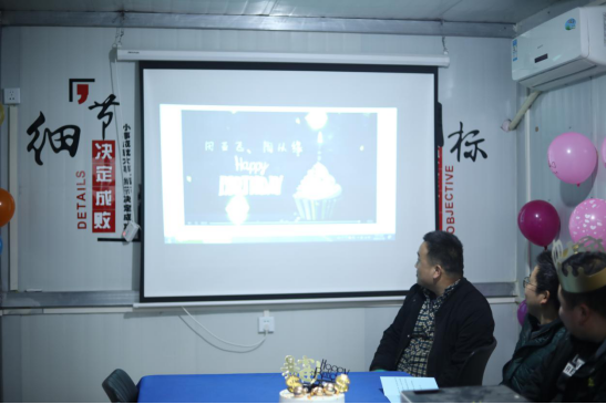 如今看到我们的伙伴,泪流满面高兴的连话都说不出来,我们的心里也是暖暖的,尽管今天没有吃上好吃的长寿面,但是心情也是开开心心的;活动开始前,摄影师和蛋糕早已在房间准备好,就等着两位寿星进入我们的活动现场,相机在一点点的记录这一刻;那时他们推开了门,屋子里的气球使房间很亮很亮,待等大家坐好后,我们的美女送上了我们精心制作的贺卡;虽然只有简简单单的几片纸,但那是我们所有人的祝福,这时我们的摄影师开始了大屏幕上像电影一样活动开头;里面放映着我们的师傅在平常工作的照片,工作那时的他们是最帅的;等短短的视频结束后,接下来到了我们寿星发言的时刻;这时的意思就是让我们的师傅都将自己的心里话都说出来,因为那些话语是他们不经常流露的!让我们知道了他们内心真实的想法,他们对我们网络部很感激,感谢我们为他们准备的宴会;但是这些准备比起在平常的工作帮助当中是不值一提的!今日的惊喜获得了圆满的成功,切开吃完蛋糕终于结束了本次的宴会!不过也很顺利,在我们准备生日宴会的时候,